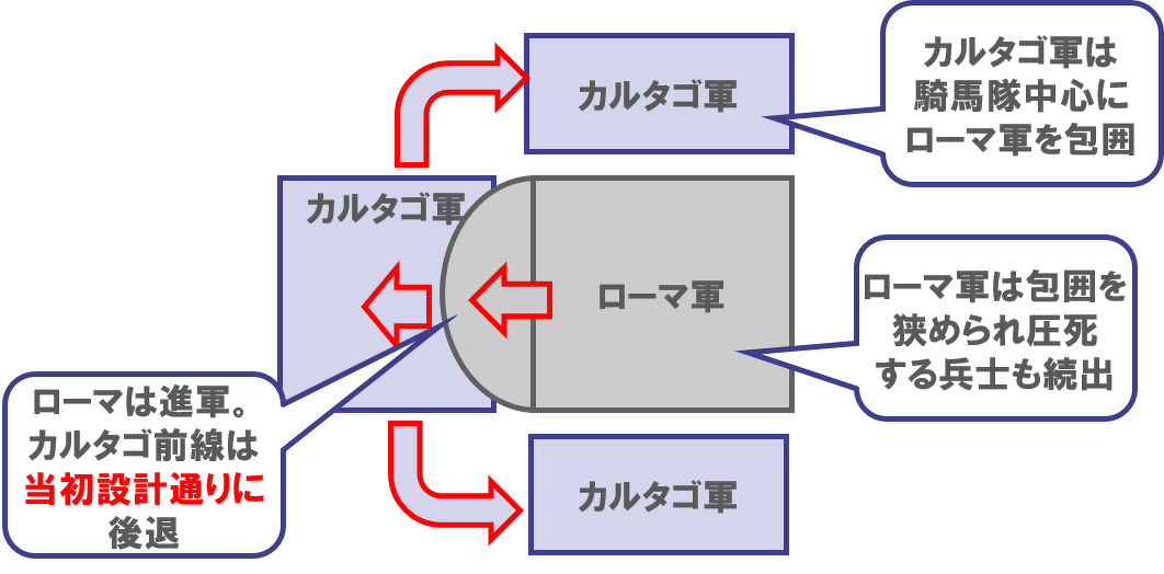 敵の行動を予測した上でローマ軍を「包囲作戦」という罠にはめたのです。